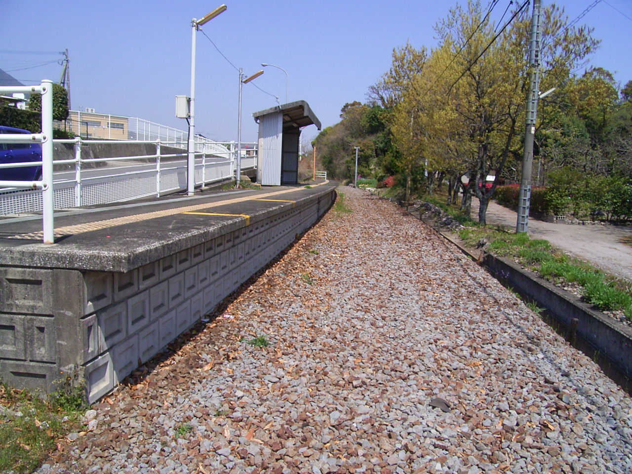 島原鉄道の2008年4月に廃止になった区間(島原外港―加津佐)にあった駅です。線路は撤去されていますがホームは現役当時のまま残っていました。鉄道独特の緩やかなカーブと周りの木々がいい味を出しています。周りは島原市郊外の住宅地という感じでした。
