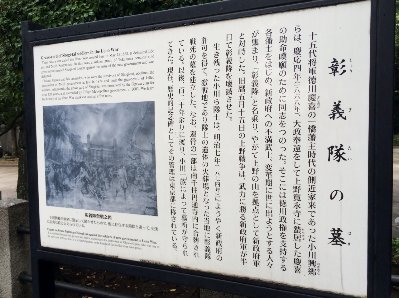 彰義隊は明治政府にとって賊軍であるため、墓石に彰義隊の文字はなく、山岡鉄舟の筆になる「戦死之墓」の字が刻まれています。