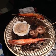お通しが海鮮類の炭焼き 好きな海鮮類を選んで自分で焼くのも変わっていてよかったです。