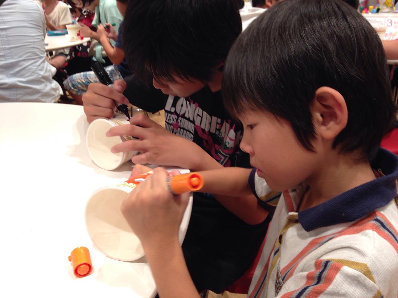 こちらでは、世界でたったひとつのカップヌードルを作れます。夏休み中でもあるため館内は、ちびっ子でいっぱいでした。まずカップヌードルの器に自分の好きな絵や文字を書きます。次にスープの味を4種類から選択、そして具を8種類からせんたくし、蓋をしてもらい完成です。次回はチキンヌードル作りに挑戦したいです。