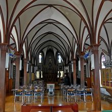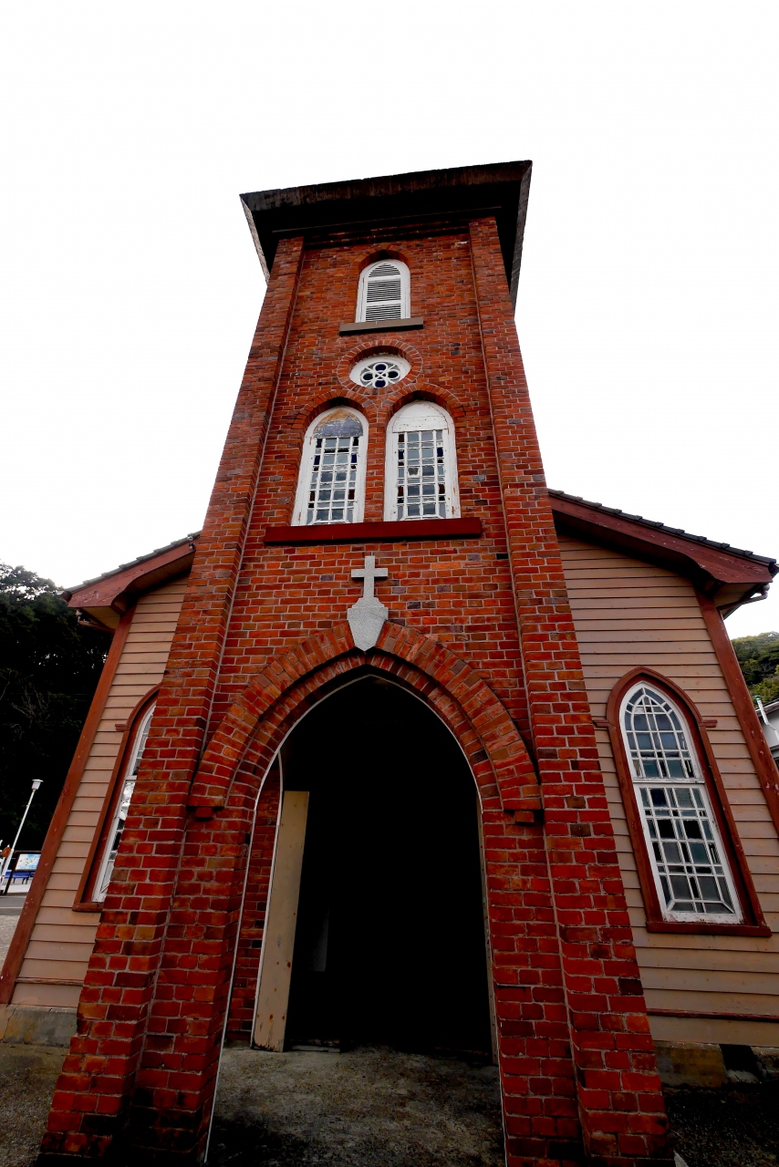 旧鯛の浦教会 旧浦上天主堂の被爆煉瓦を用いた鐘塔がある.その他は木造なのでそのコントラストが面白い.中は資料室兼図書室になっている.キリシタン崩れのころの資料がある.新しい聖堂は近代的.1979年.一世帯なんと80万円も拠出.信仰心御強さを物語る.ルルドがある.また鯛の浦六人切りの悲しい歴史やカトリックの偉人たちの像もあり.五島のキリシタン史を垣間見ることができる教会だ.保護者は聖家族