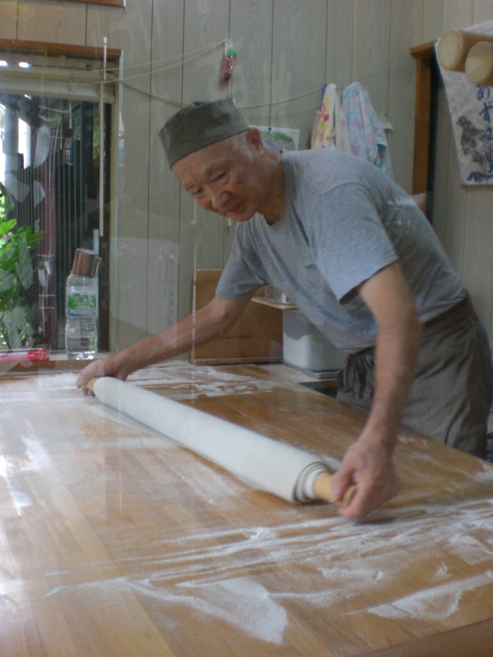 通りからガラス越しにお爺ちゃんがお蕎麦を打ってます。