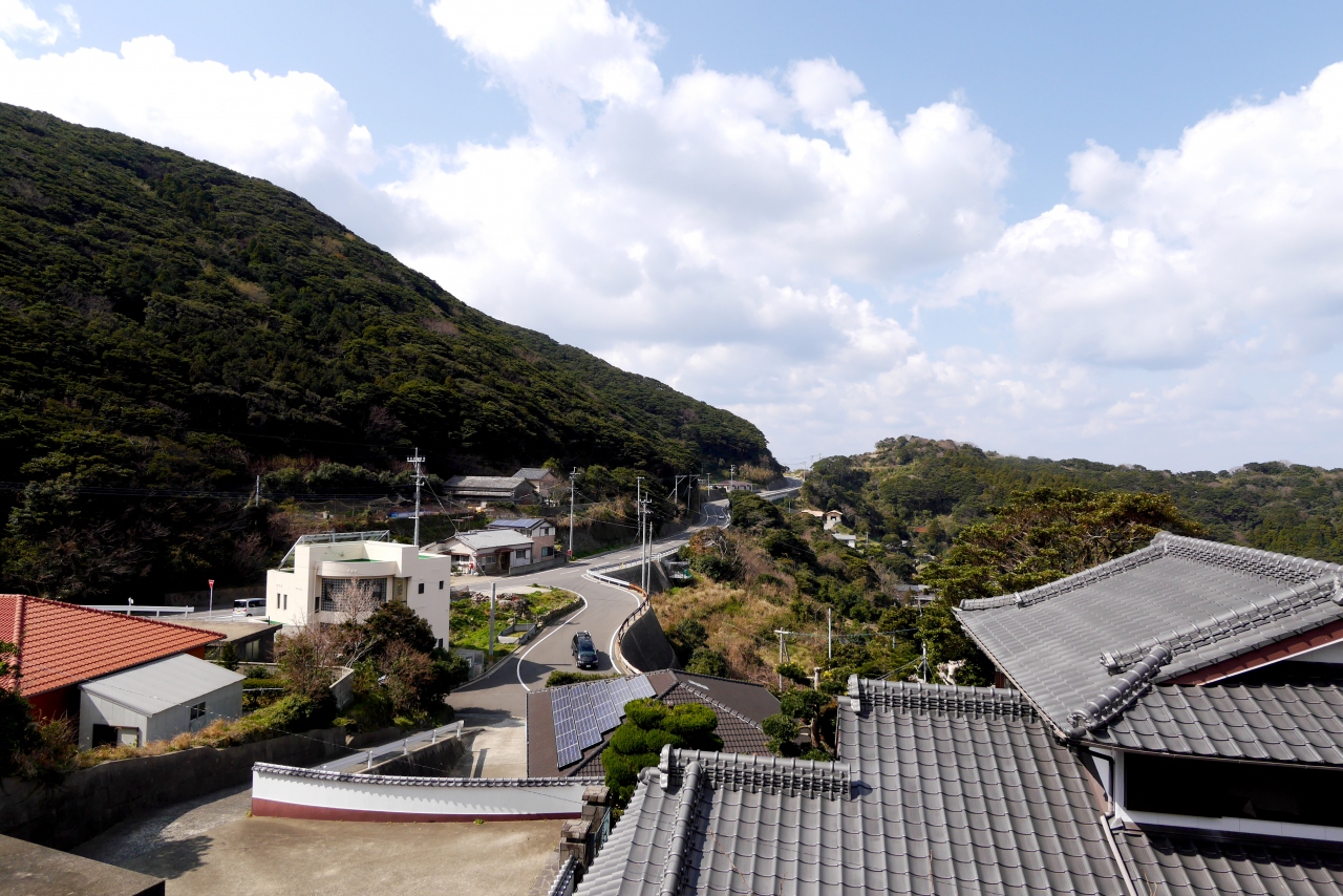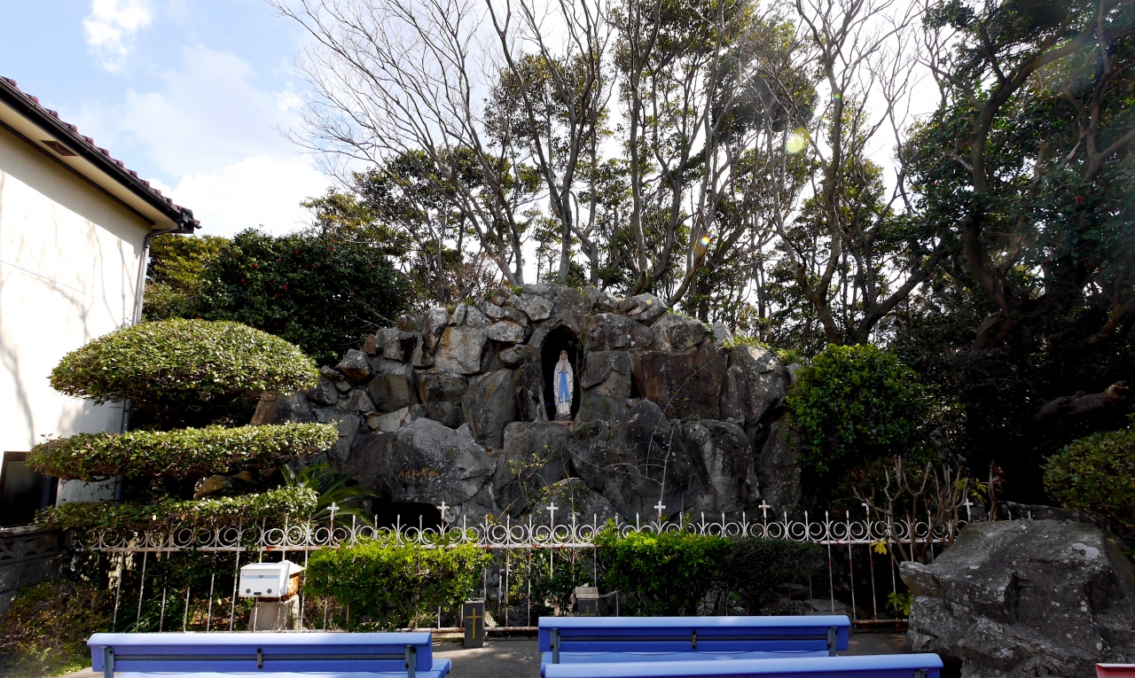 青い海をイメージしたような祭壇がきれいな近代的な教会.保護者は無原罪の聖母.聖母が見下ろすので,身が引き締まるし優しさも感じる教会.1966年建立.県道32号線を少し入った丘の上にある.ルルドもある.津和崎に向かうとき寄るとよい