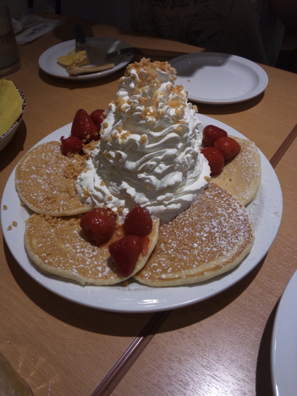 しばらくすると期待どおりの山盛りクリーム!とても軽い食感のクリームなので全くくどくなく、溶けてくるので急いで食べました。オムレツはチーズがとけていて想像以上においしかったです。はじめはパンケーキを2つにしようか迷っていましたが、甘いパンケーキとはオムレツの組み合わせにして正解でした。