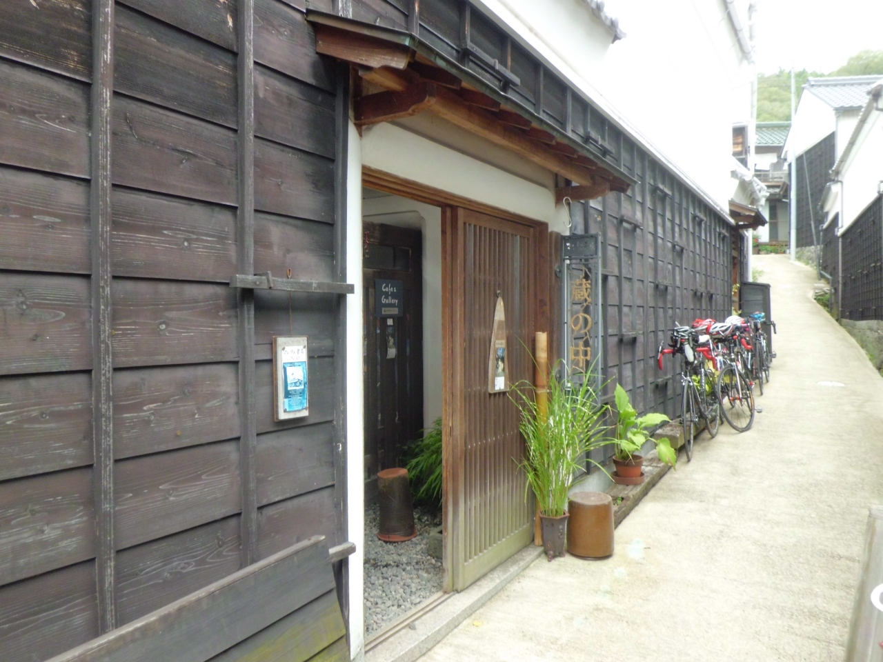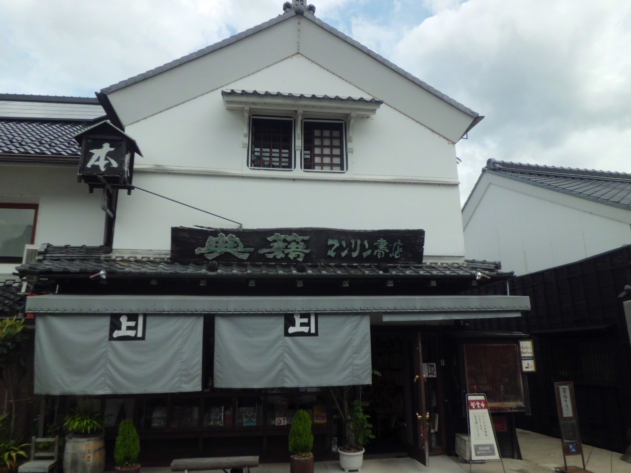 足助の古い町並みの中にあります。白壁の土蔵で、道路正面からのぞけますが、入り口は脇の小路からとなっています。脇から入ると左が書店、右がギャラリーとなっています。マンリンという名前は、ここのお店の屋号が萬屋さんで、当主は代々林右衛門を名のったことから、マンリンという名がつけられたそうです。