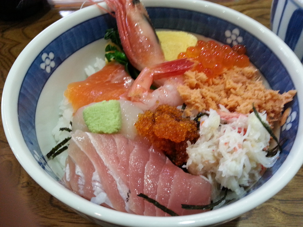 イカ釣り広場がある函館朝市駅二市場の二階にワンコインで海鮮丼が食べられる食堂があります。丼の器が小ぶりなので男性ですと2杯分は食べられるのではないでしょうか。私は海鮮丼と名前は忘れましたがイカの漬け丼を平らげてしまいました。
