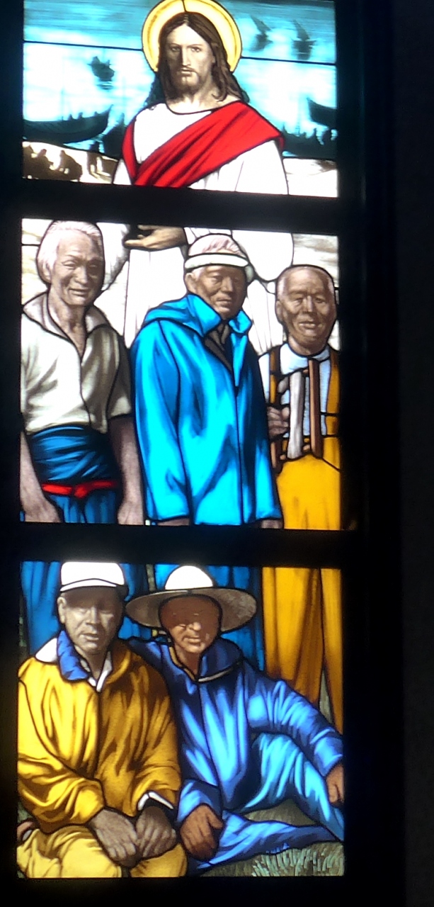 素晴らしいステンドグラスに囲まれた教会!わずか70戸の信徒が百数十万円ずつ拠出して建てた教会!1978年三代目の教会とのこと.漁師を弟子にするというところでは本来聖シモンと聖アンデレだが,ここではこの地の漁師の人々と思われる群像が書いてある.感激した!保護者は聖ヨハネ五島.これだけのステンドグラス.五島随一と思う.ポルトガルのファティマの奇跡や聖ヨハネ五島像もある.小中学生の書いたポスターも愛らしい.