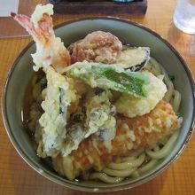 えび天や野菜天のほか、唐揚げまで乗っている。