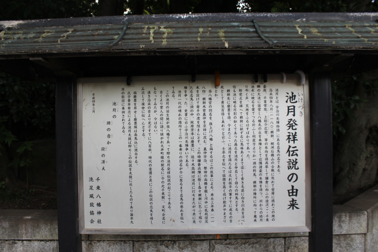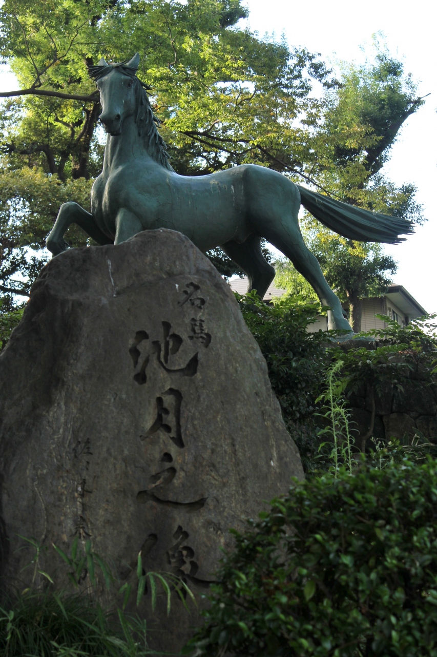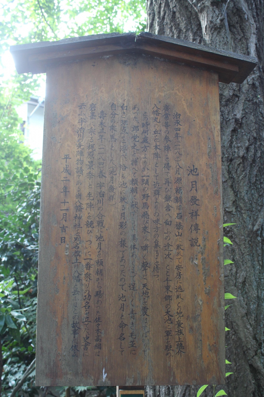 東急池上線洗足池駅から徒歩10分程の洗足池の北西のほとりに鎮座する神社です。源頼朝が安房国から鎌倉へ向かう途中でこの地に宿営した際、たくましい野生馬が現れこれを捕らえたが、その馬が後の宇治川先陣物語の名馬「池月」であった。境内には池月の像が安置されています。