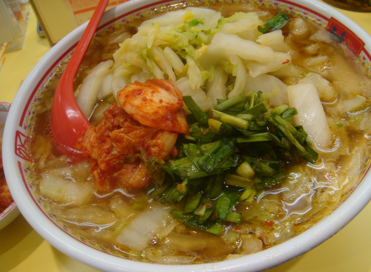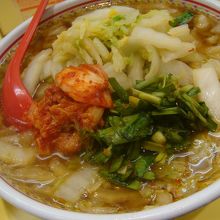 トッピングのキムチと、ピリ辛のニラ(無料)をのせて頂きます。
