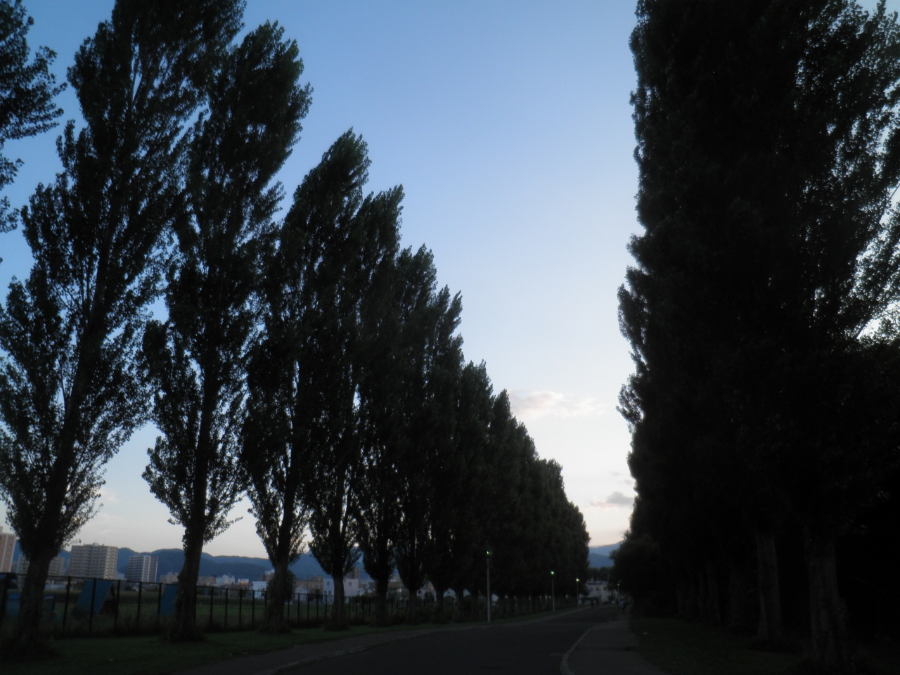 北海道大学の札幌キャンパスの西側にあり、JR桑園駅にぬけるところに平成ポプラ並木があります。 ここは、大学の農場の端にあるため眺めがよく、手稲山も遠くに眺めることができました。 並木のポプラは若々しくて背が高く、夕暮れ時になると雰囲気いいと思います。