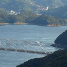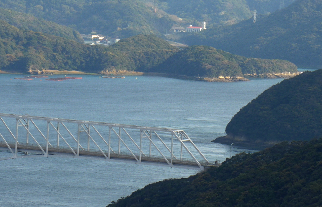 大平教会の帰りに,龍観山園地に上る.ここも険しく,若松から直接でも山道を10分ほど車で登る.半島のようなところの頂上にある.しかしだからこその絶景.若松瀬戸をすべて見渡せるようだ!若松大橋からなんと桐教会まで見えて感激.中通島・若松島の中では一番の絶景だろう!
