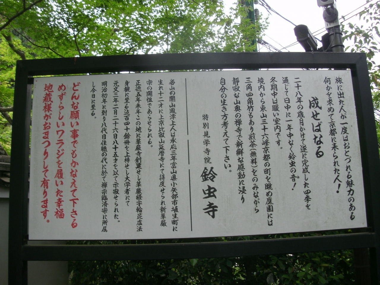 冬でも鈴虫が鳴いていることと、お坊さんのユニークな説法で人気があるお寺さんです。説法を聞いてお守り(\300)を買って、身の丈にあった1つだけ願い事をするとお寺の入り口にある草履を履いたおじぞうさんが願いを叶えにきてくれるそうです。