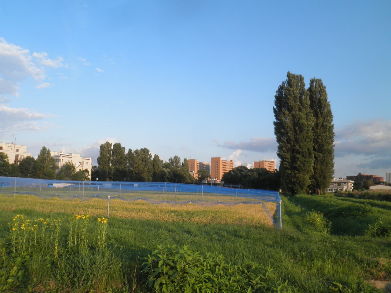 8月の終わりごろ、北海道大学の札幌キャンパスを夕方に散策しました。 農場のそばにある良く知られているポプラ並木のそばでは、水田で稲の穂が小金色に色づいていました。ポプラの葉は青々していました。また、牧草地では乳牛がのんびり草を食んでいました。