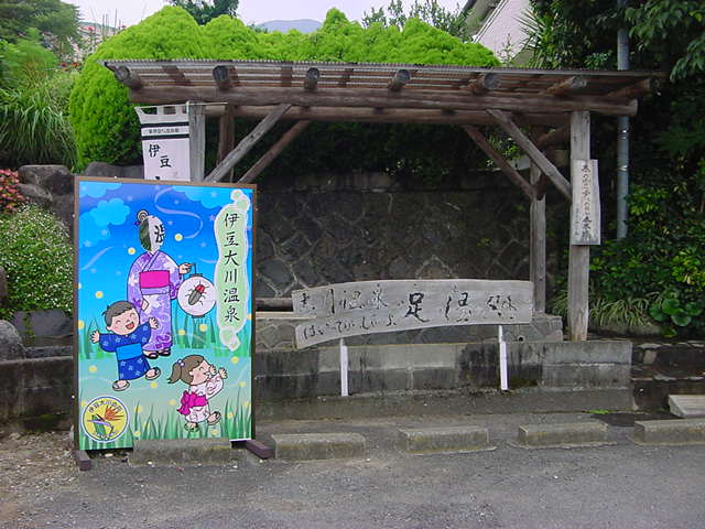 伊豆大川駅は伊豆急行の小駅。温泉地は海岸沿いにあるので、駅の周囲はまったく観光の雰囲気がありません。駅の改札は周囲よりも高いところにありますが、それを出て正面にこの足湯があります。列車待ちの時間にゆっくり足湯を楽しめる施設です。