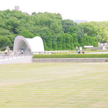 平和記念資料館を見学したあと、死没者慰霊碑に向かうまで、広い公園になっています。ここを歩くときに、今がいかに平和であるかを実感できると思います。8月6日には式典が行われる場所なので、その準備が進められていました。