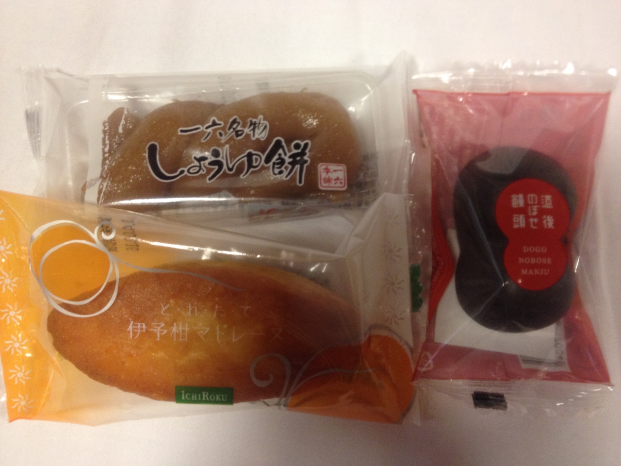 一六タルト以外に新旧のお菓子もあり、しょうゆ餅と道後のぼせ饅頭ととれたて伊予柑マドレーヌを買ってみました。
