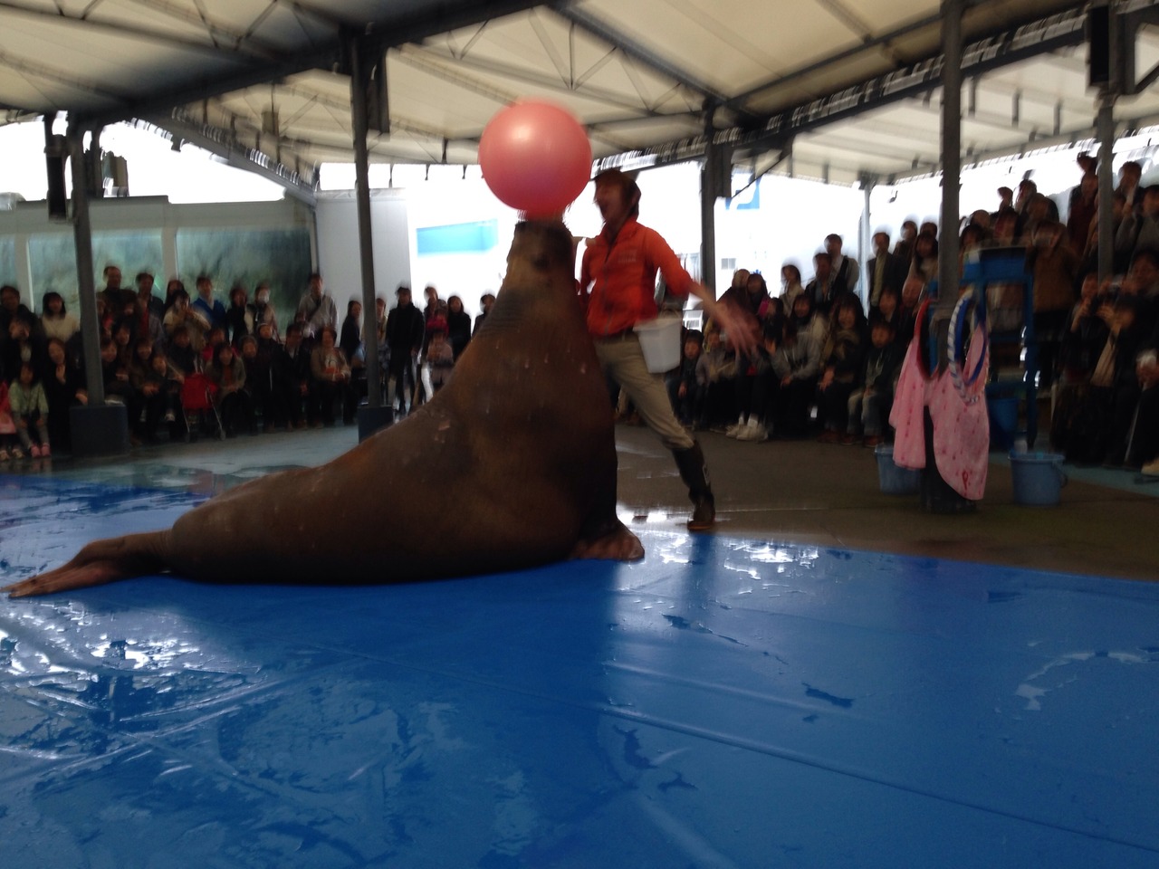 二匹のセイウチのうち一匹はほとんど芸もなく???なのですが、またそこが笑いのツボです。