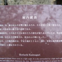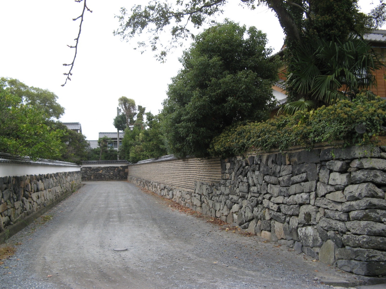 鍵曲は左右を高い土塀で囲み、道を鍵の手(直角)に曲げた道で、敵からの攻撃を防ぎ、守り易いように作られた独特な道筋です。