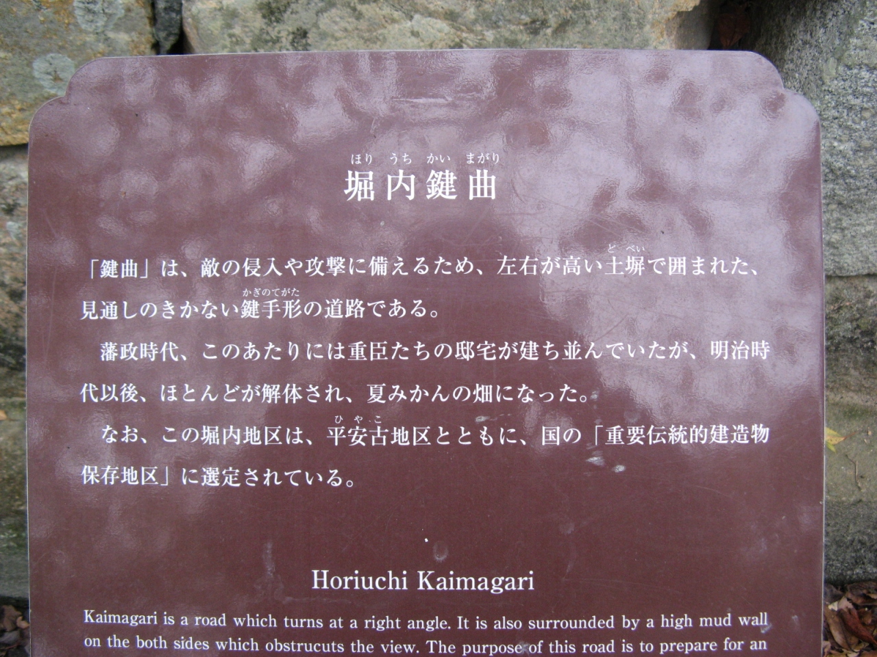 「堀内の鍵曲(かいまがり)」は、JR山陰本線の玉江駅から歩いて10分足らず、 萩城三の丸の伝統的建造物保存地区にあります。