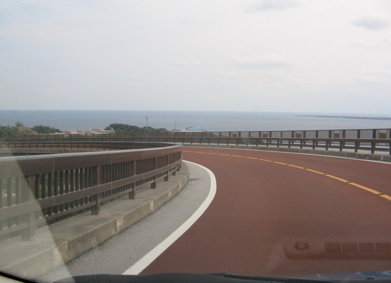 ところが下方に海が見え始めた頃、「そろそろ橋かなあ」と思っている内、ニライカナイのループを通過してしまいました。ニライカナイ橋とは本来ならば展望スポットに立ち寄って見物すべき場所なのでしょうね。私は時間も余裕がなかったのでそのまま下の国道に降り次の観光スポット(おきなわワールド)に向かいました。