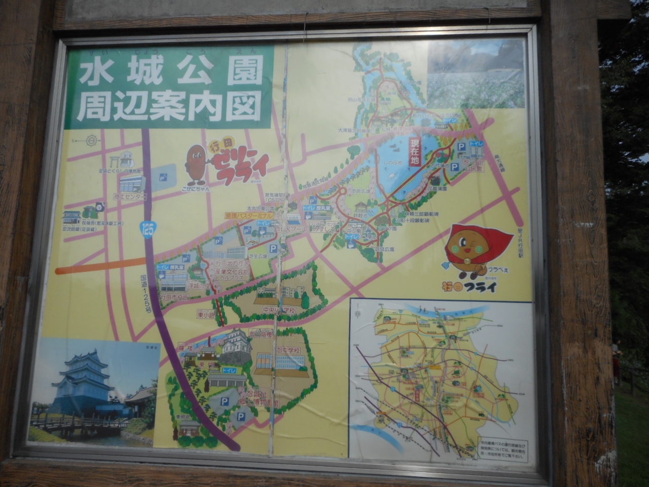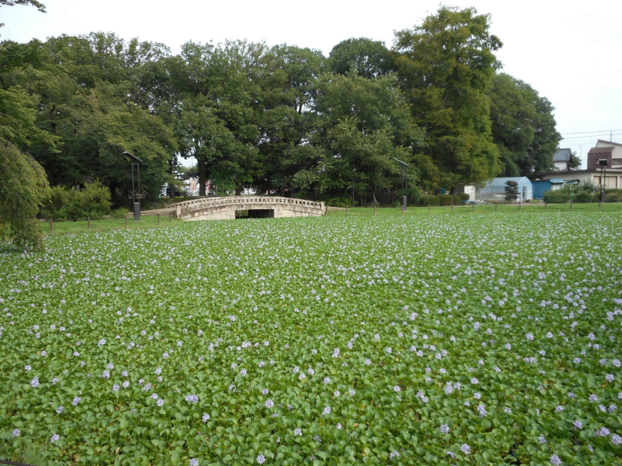 市役所の方から歩くと、子ども達の遊び声が響いている市民プールを過ぎ、進むと広い池が現れます。芝生の広場もあります。