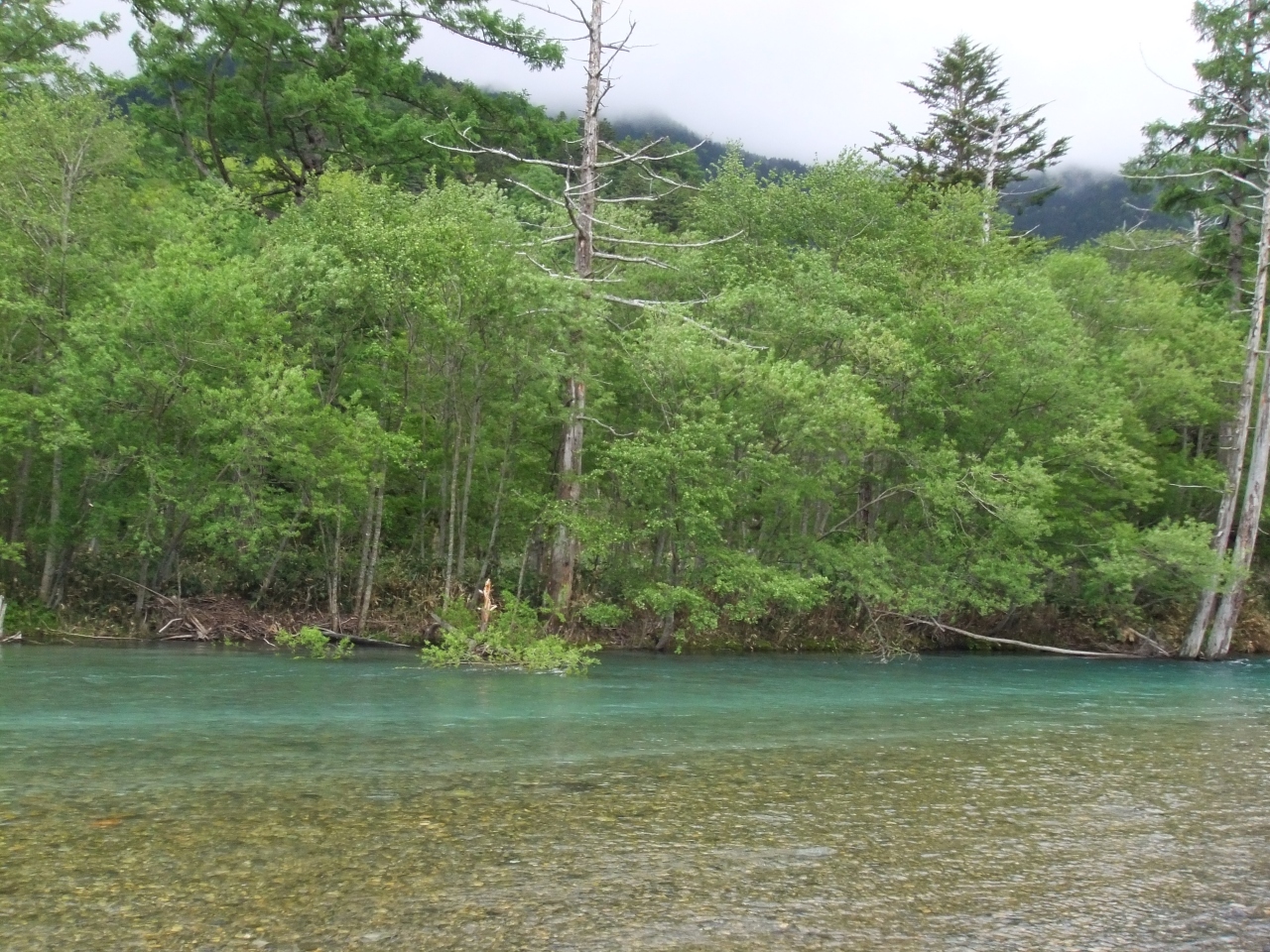 田代池から梓川コースを沿って歩くと梓川の澄んだ透明度と遠くの方はライトブルーという色の変わりを見ることができます。川の水を触ってみると痺れるほどの冷たさでした。トレッキングも疲れてきたころにこの川をみるとファイトがわいてきました