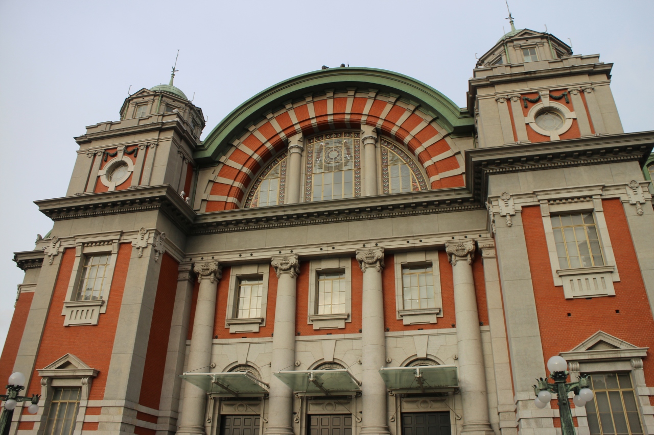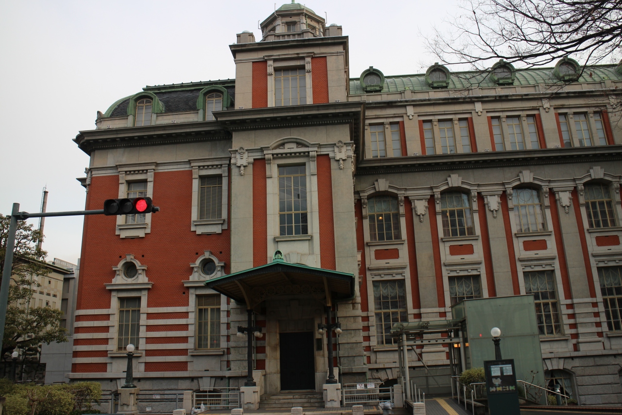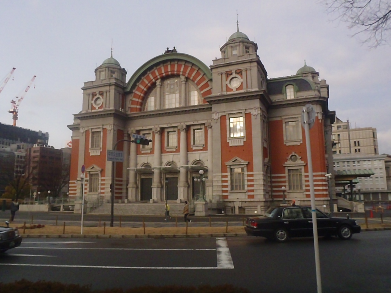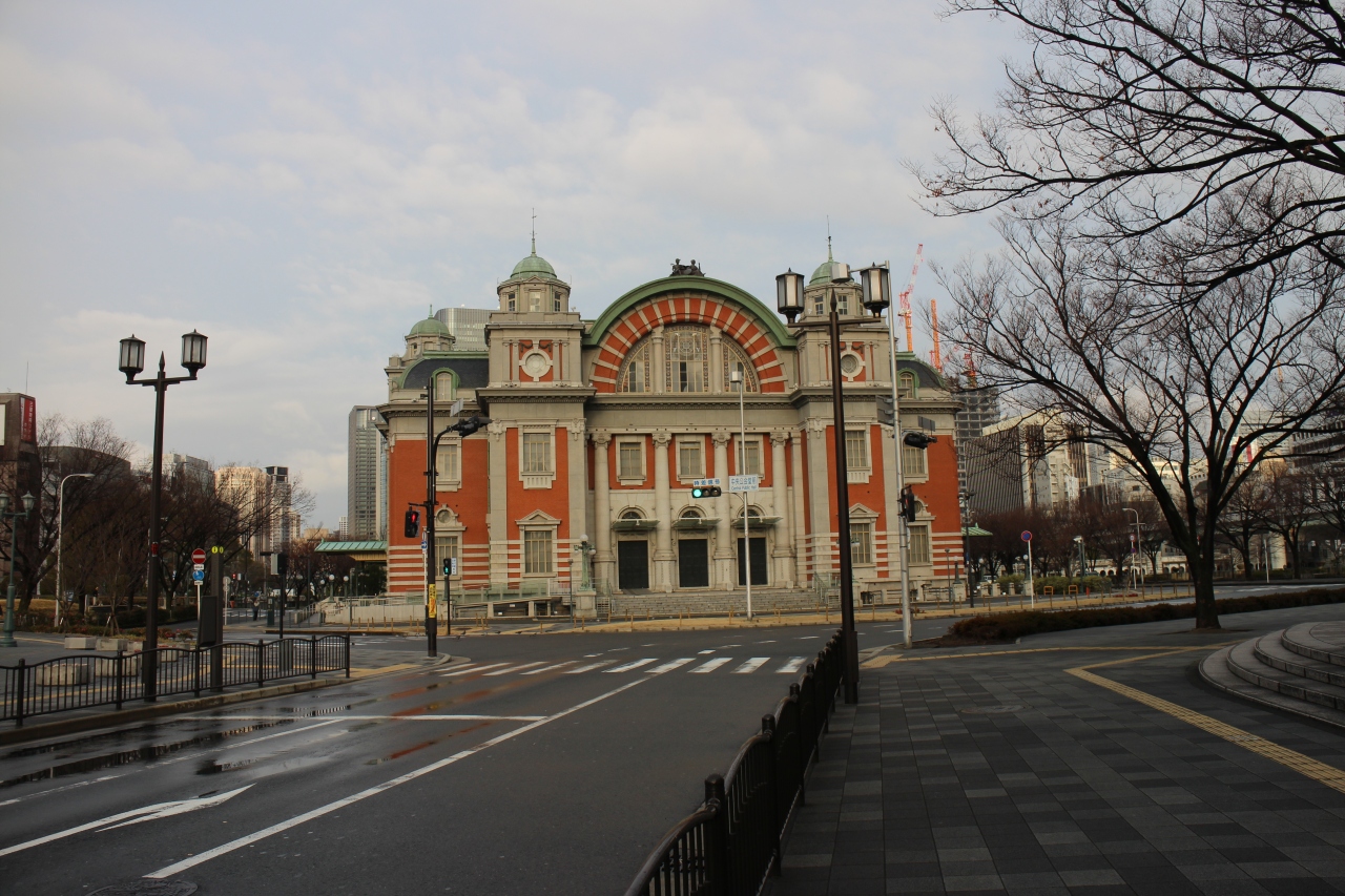 土佐堀川の中洲、御堂筋の大江橋と淀屋橋と堺筋の難波橋の間、大阪市役所の東側にある大正7年に完成した赤レンガと青銅製のドーム屋根が印象的な建造物です。