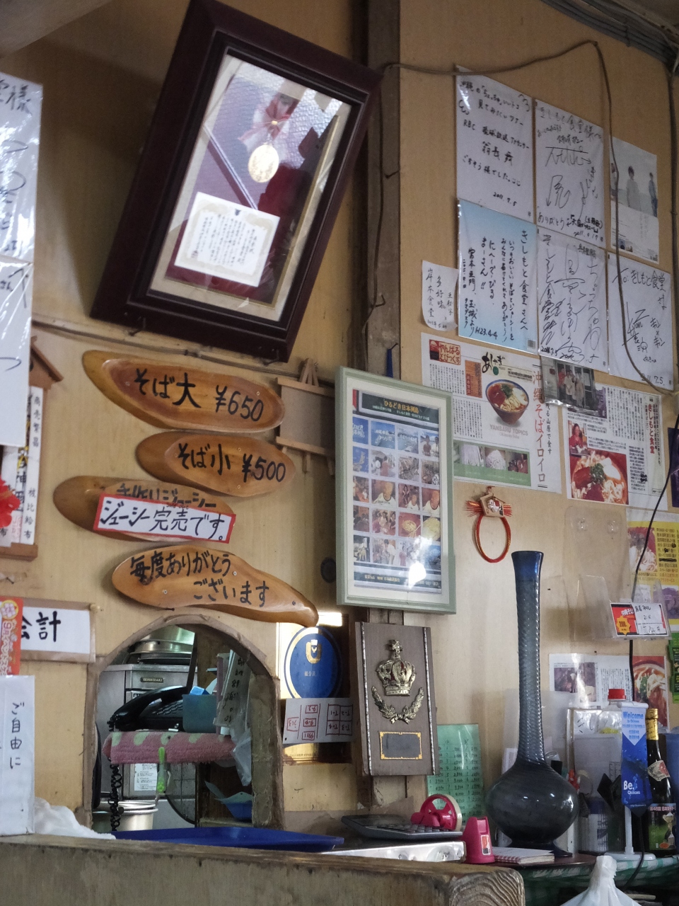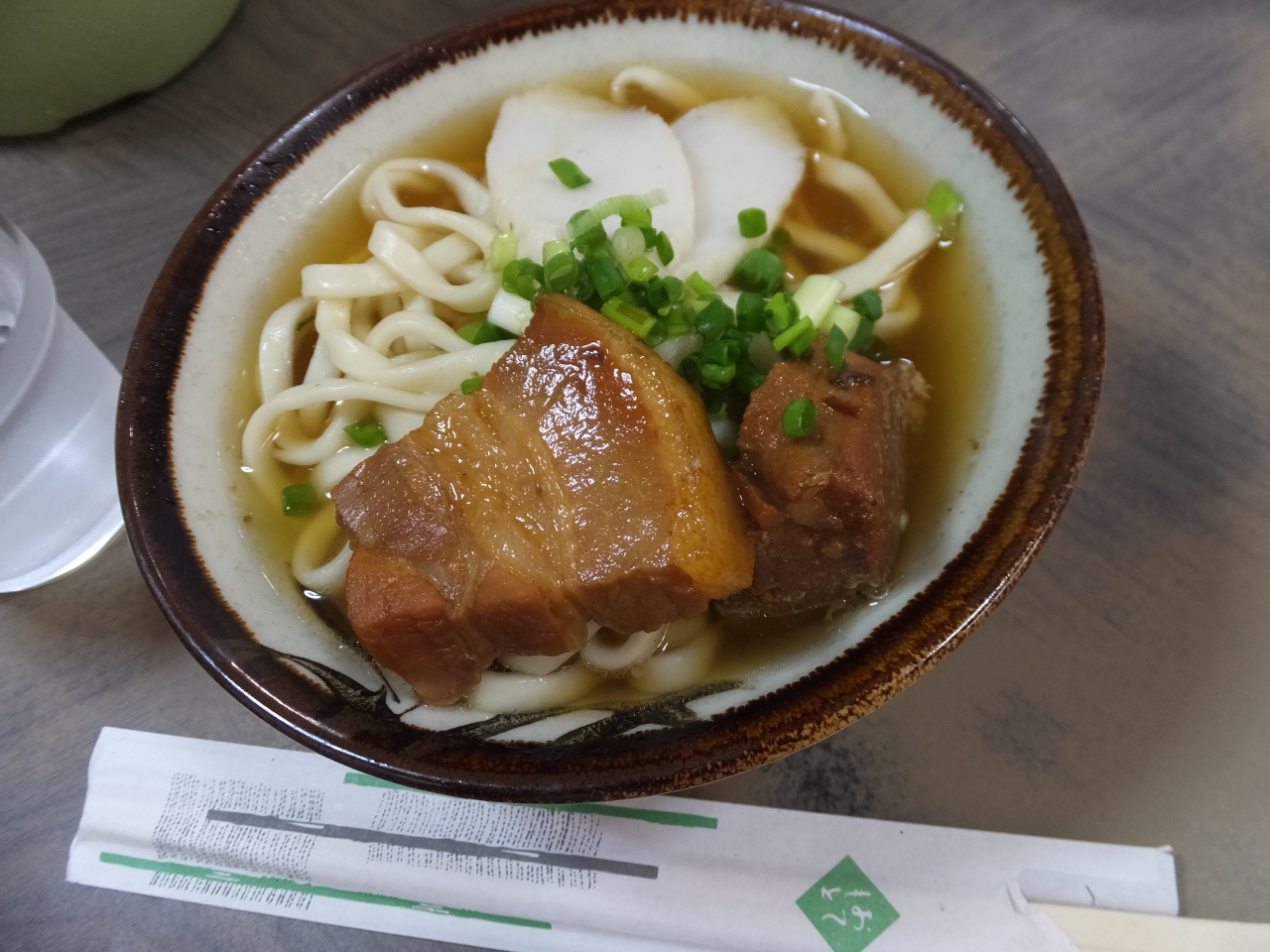 そばのはしごで2軒目に行きました。ソーキそば小(500円)を注文。出汁が効いたスープにコシのある麺。15時過ぎに入店しましたが、次々にお客さんがやって来て常時満席。店内はサイン色紙が壁一面に貼ってあります。中は広くなく、ゆっくりできませんが地元の雰囲気が味わえます。