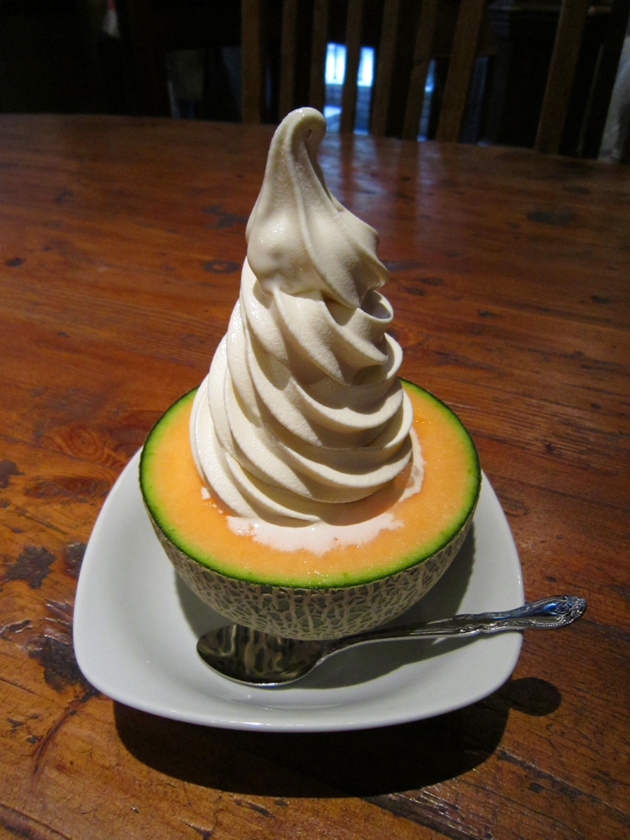 富良野に本店があるお店で、目玉はメロンを使った商品です。その代表格がサンタのひげで、メロンにソフトクリームが乗っています。メロン半玉のサイズと小サイズもあります。