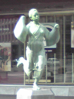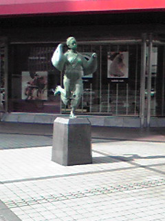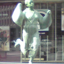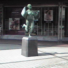 県民百貨店の外のベンチの前で、交通センターの正面横にあります。急にぽつんとあり、おてもやん像はいがいと小さいです。足元の土台のところにおてもやんの由縁などの説明が書かれています。たまに観光客の方が写真を撮っているのを見ますが、普段はほとんど素通りされています。さびや汚れなどもほとんどなくきれいです。