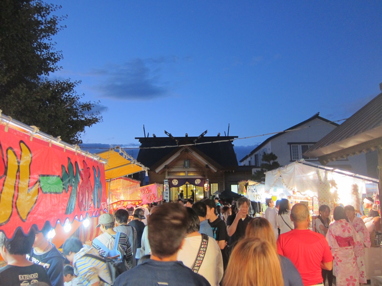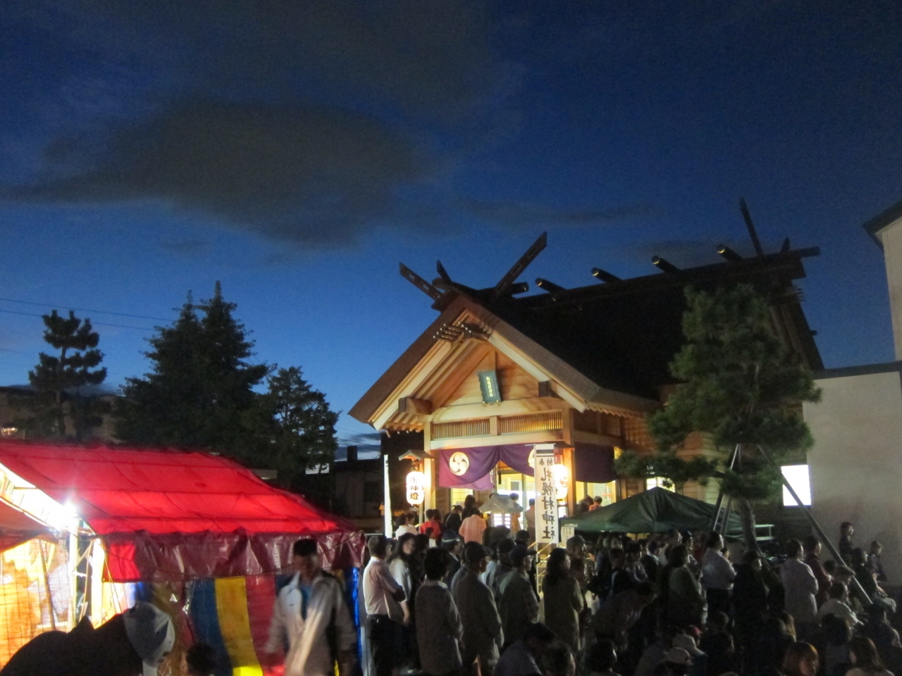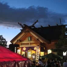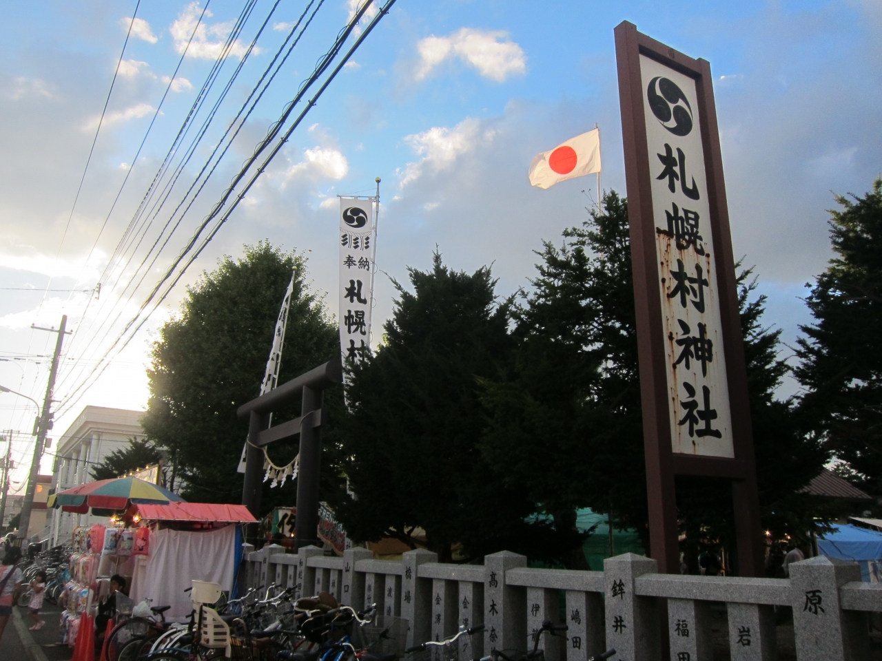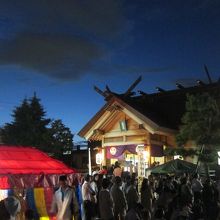 当日は神社の前の道が自転車置き場になっていました。また、近くのあざみ公園の横に路上駐車をしている車もありました。神社は、地下鉄東豊線、環状通東駅の1番出口から100mちょっとの距離です。出口を出て北洋銀行の角を曲がって100mほど行ったところです。神社は街中の住宅街の一角に紛れてあるという感じで、最初、場所が分かりにくいかもしれません。お祭りでは境内に屋台が並び、近所の人達が大勢訪れていました。