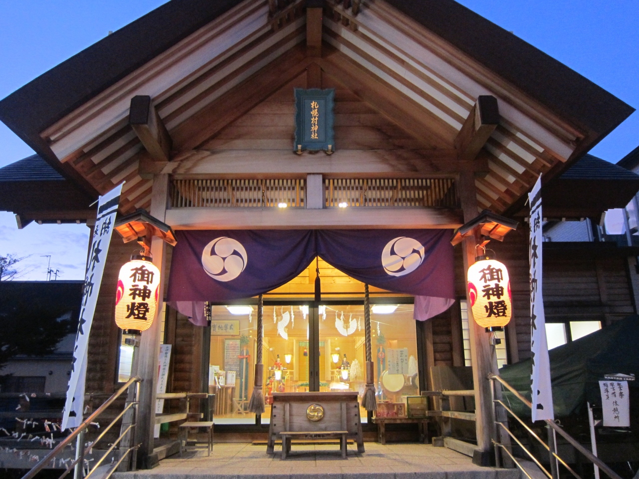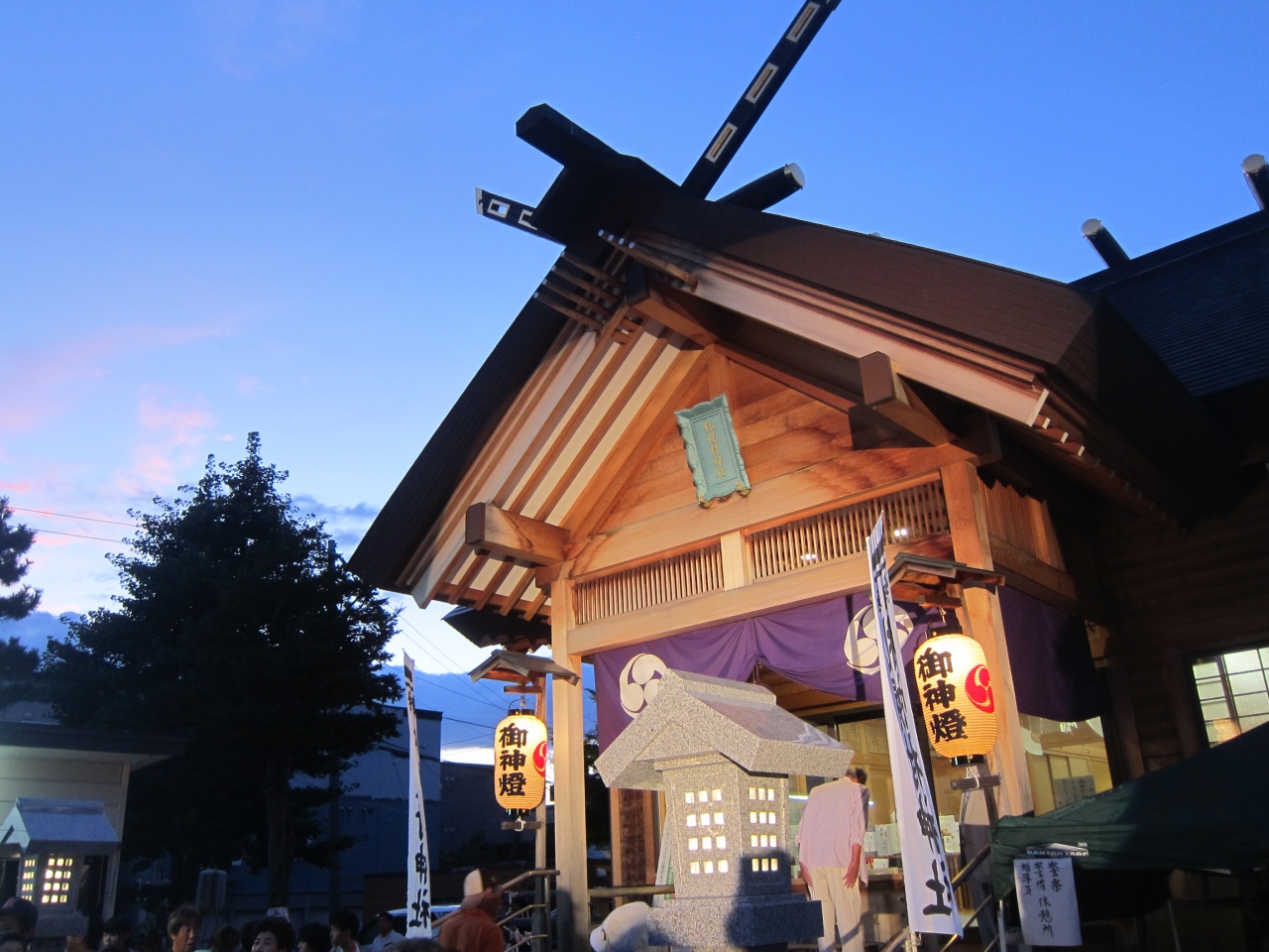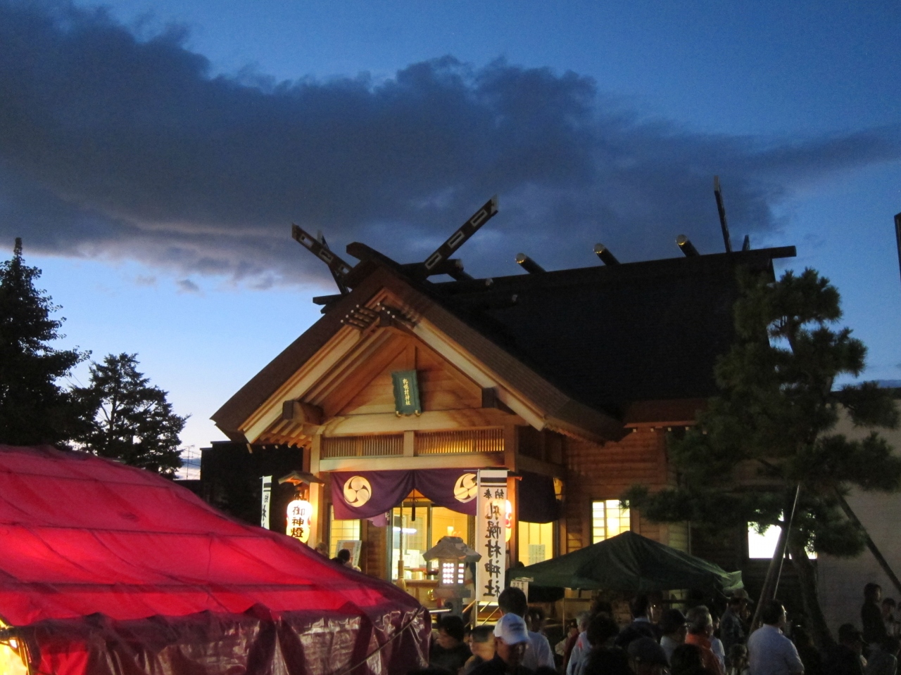 当日は神社の前の道が自転車置き場になっていました。また、近くのあざみ公園の横に路上駐車をしている車もありました。神社は、地下鉄東豊線、環状通東駅の1番出口から100mちょっとの距離です。出口を出て北洋銀行の角を曲がって100mほど行ったところです。神社は街中の住宅街の一角に紛れてあるという感じで、最初、場所が分かりにくいかもしれません。お祭りでは境内に屋台が並び、近所の人達が大勢訪れていました。