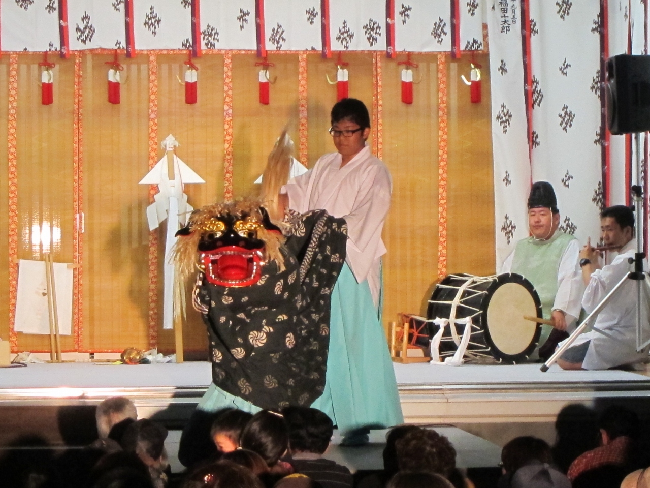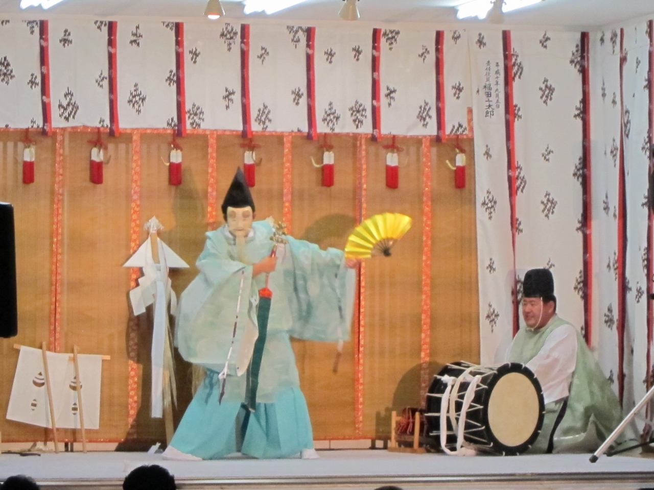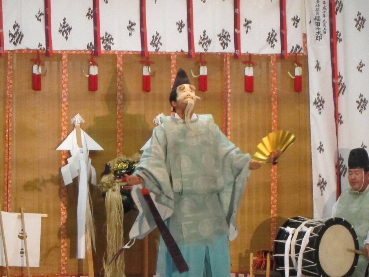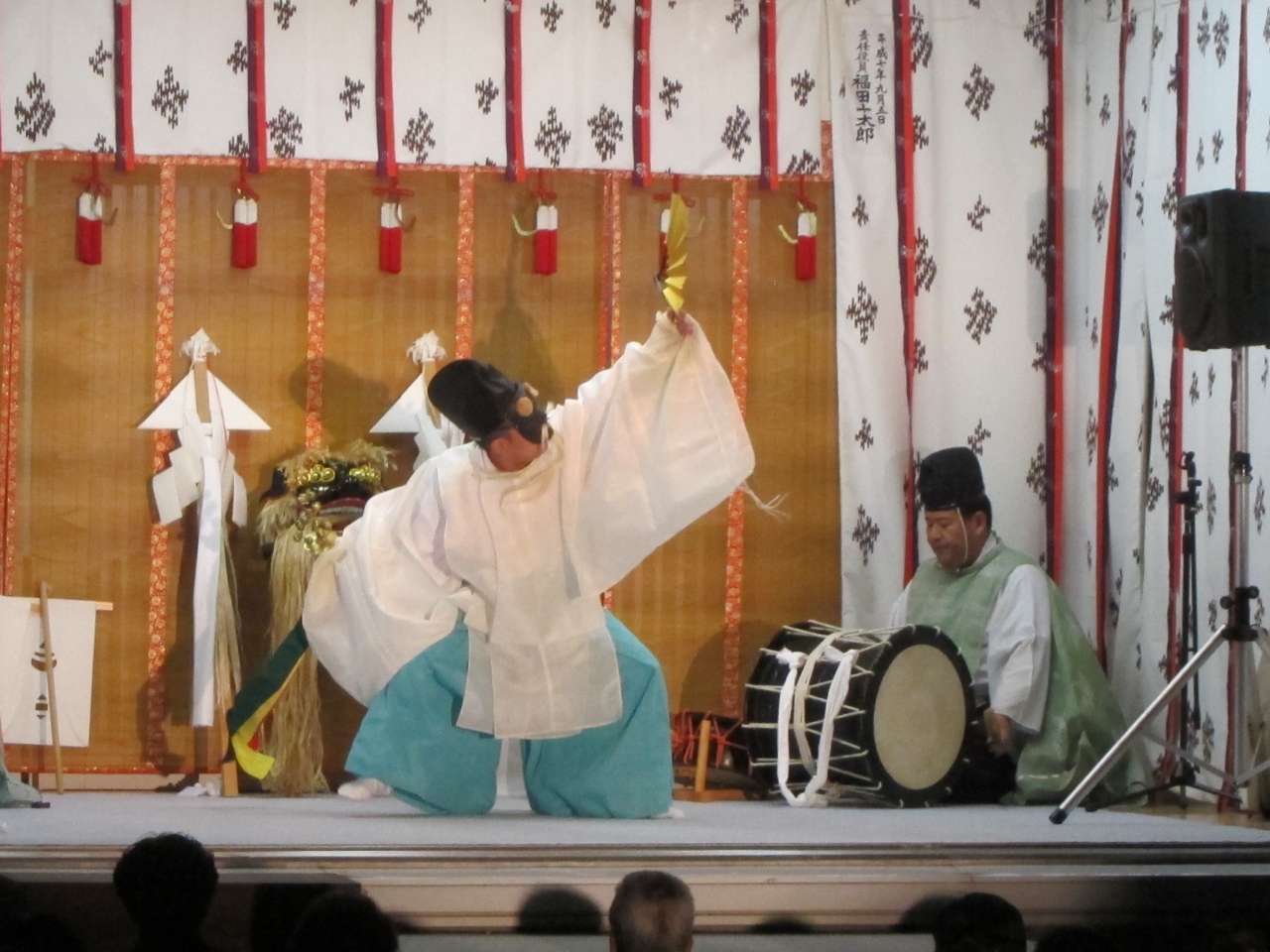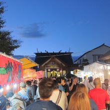 9月5日が例大祭ですが、2014年は、9月6日・7日が土日のため、そちらに移動して2日間にわたって開かれました。両日とも午後6時から檜山神楽が奉納されます。お祭りでの一番の見物です。本殿横の神楽殿の前にはブルーシートが敷かれ、神話にまつわる舞や、獅子舞、害虫を払い豊作を祈願する舞などが1時間にわたり奉奏されました。