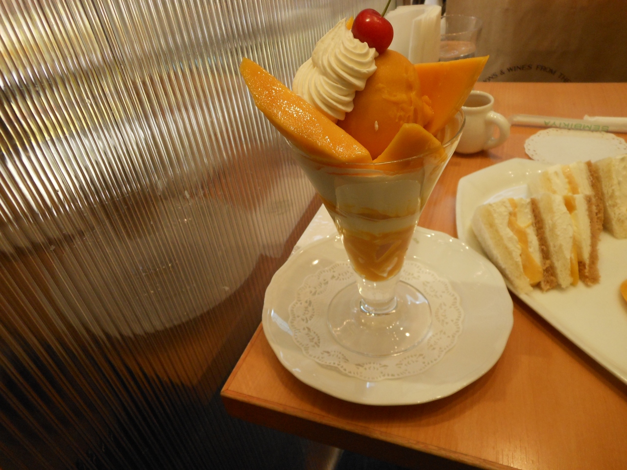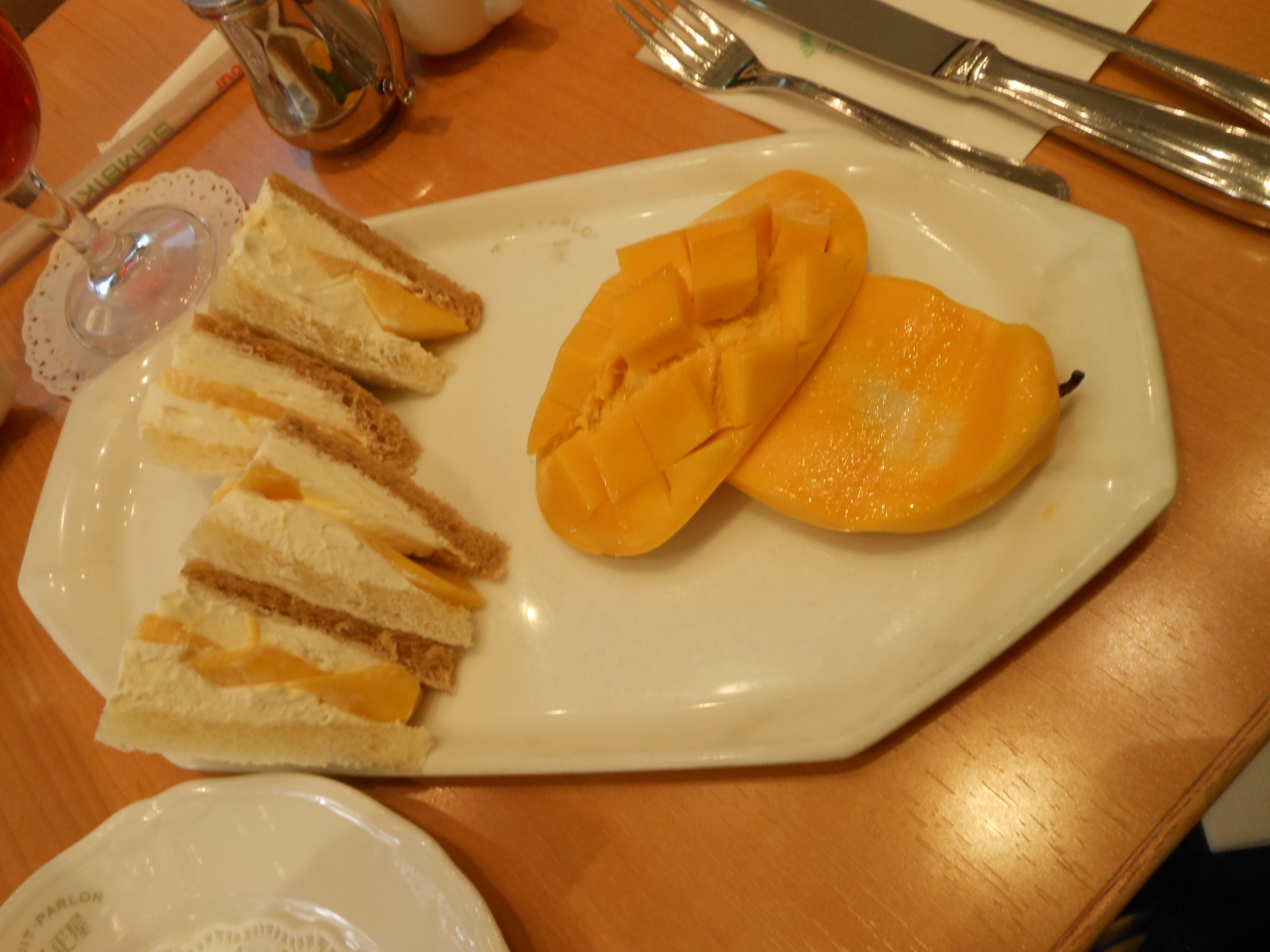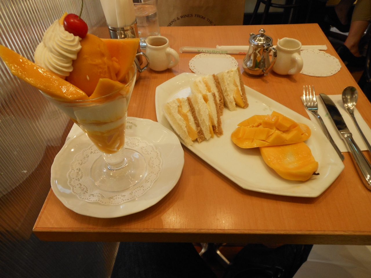 今回はマンゴーのイベントです。移動で通ってらマンゴーのイベントがりました。ただ、席が狭いのでデートで使うには雰囲気的にももう一つかもしれません。マンゴーのサンドイッチとマンゴーのパフェをいただきました。ちょうど良い熟した加減のものをいただけることができます。でも、場所的雰囲気を考えると高いかな。