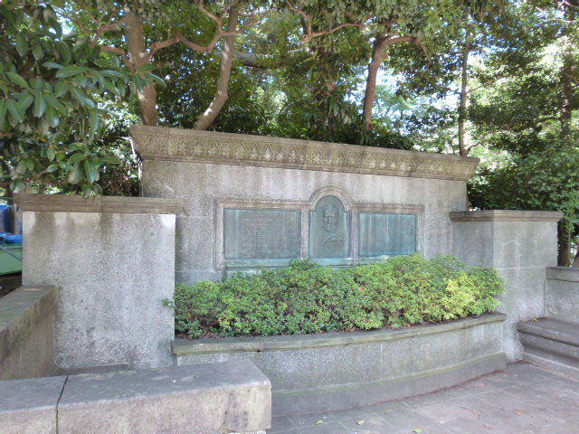 上野公園を散策していると、西洋人の肖像が掘られた銘盤のある大きな石碑が目に留まりました。こちらは「グラント将軍植樹碑」で、すぐ脇に案内板がありました。
