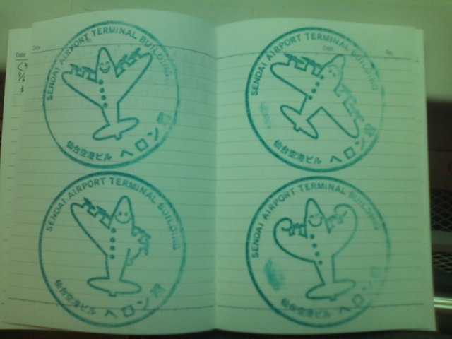 今回、初めて仙台空港で記念スタンプを押させて頂きました。どこにあるのかなと不思議に思っていて案内所で尋ねたら、係の方が徐に紙袋を4つ取り出してきて、それぞれに仙台空港のマスコット(?)、ヘロン君の違うデザインのスタンプが入っていました。それぞれがとても可愛らしいデザインなので、仙台空港にお立ち寄りの際は是非記念スタンプをゲットして下さい。