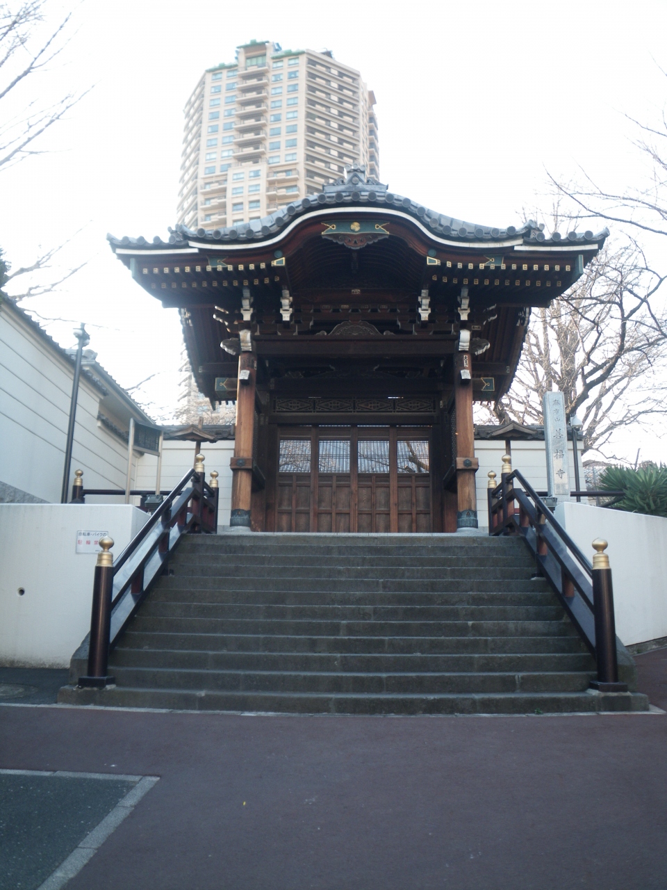 麻布山の中門で、文永の役(1274)に亀山天皇の勅使寺となった頃から勅使門と呼ばれているそう。昭和25年の東京大空襲で焼失、現在の門は昭和50年に再建したもの。木造の厳かな門のうしろに高層ビルがそびえたつ不思議な光景は、勅使門の尊厳を半減させているようで、何だか複雑な気持ちになりました。