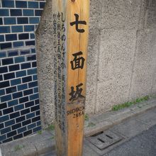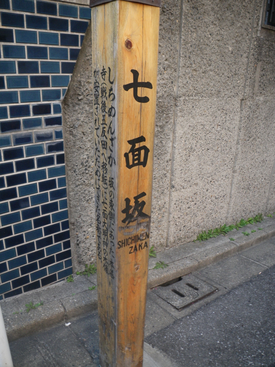 暗闇坂を登る途中で七面坂の標識を発見。ゆるやかな坂で1ブロック程度の短い坂でした。標識に「坂の東側にあった本善寺(戦後五反田へ移転)に七面大明神の木像が安置されていたためにできた名称である」と説明書きがあり、その名の由来がわかりました。