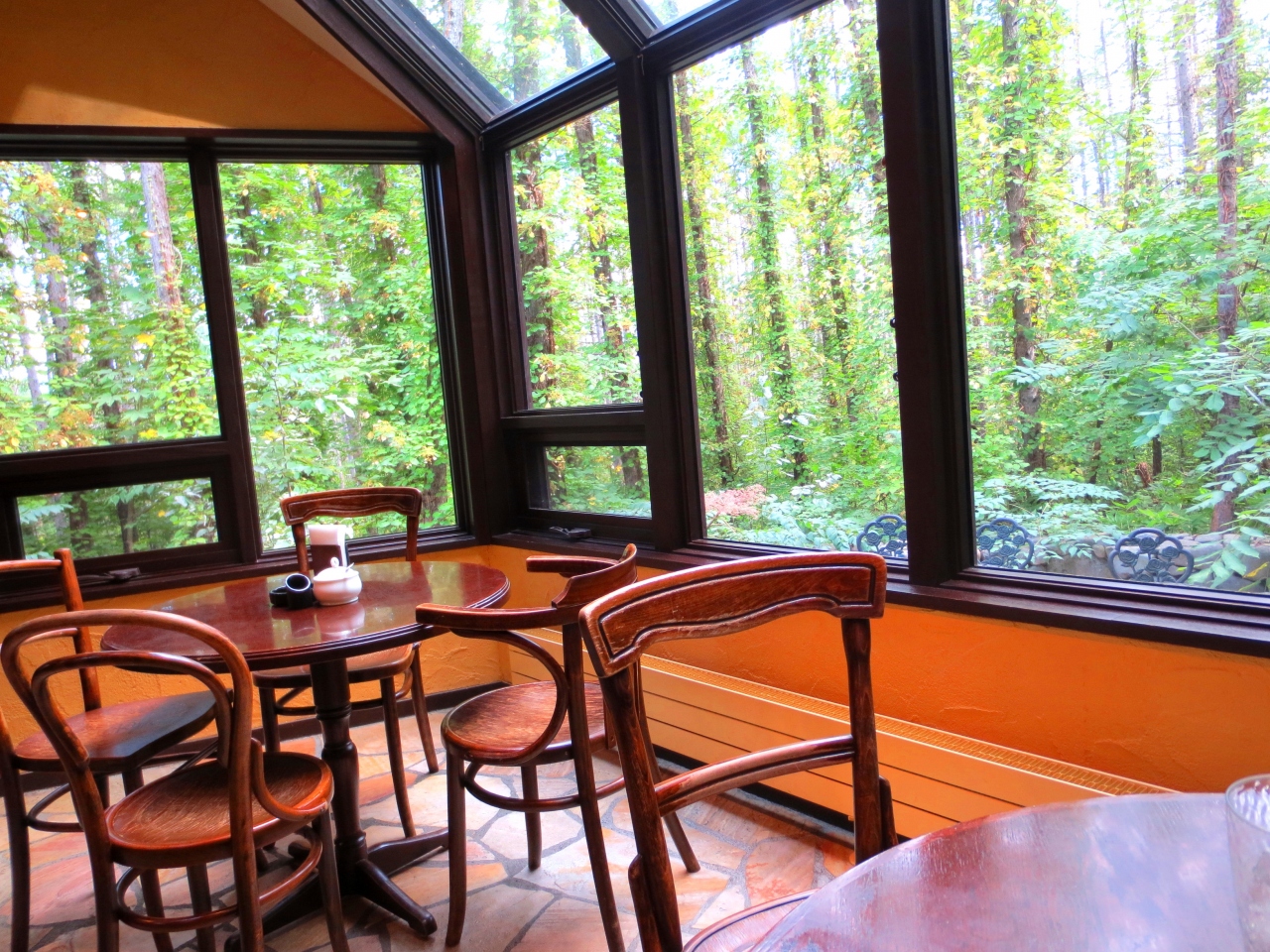 富良野に行った時は毎回訪れたくなるお気に入りスポット。森の中にたたずむ建物はドラマ用に作られましたが、ドラマを見た人はもちろん、見ていない人も、とても落ち着いた時間を過ごすことができます。カウンター席は人気があります。カウンター席ではなくても、開放感あふれる窓から森の景色が楽しめます。