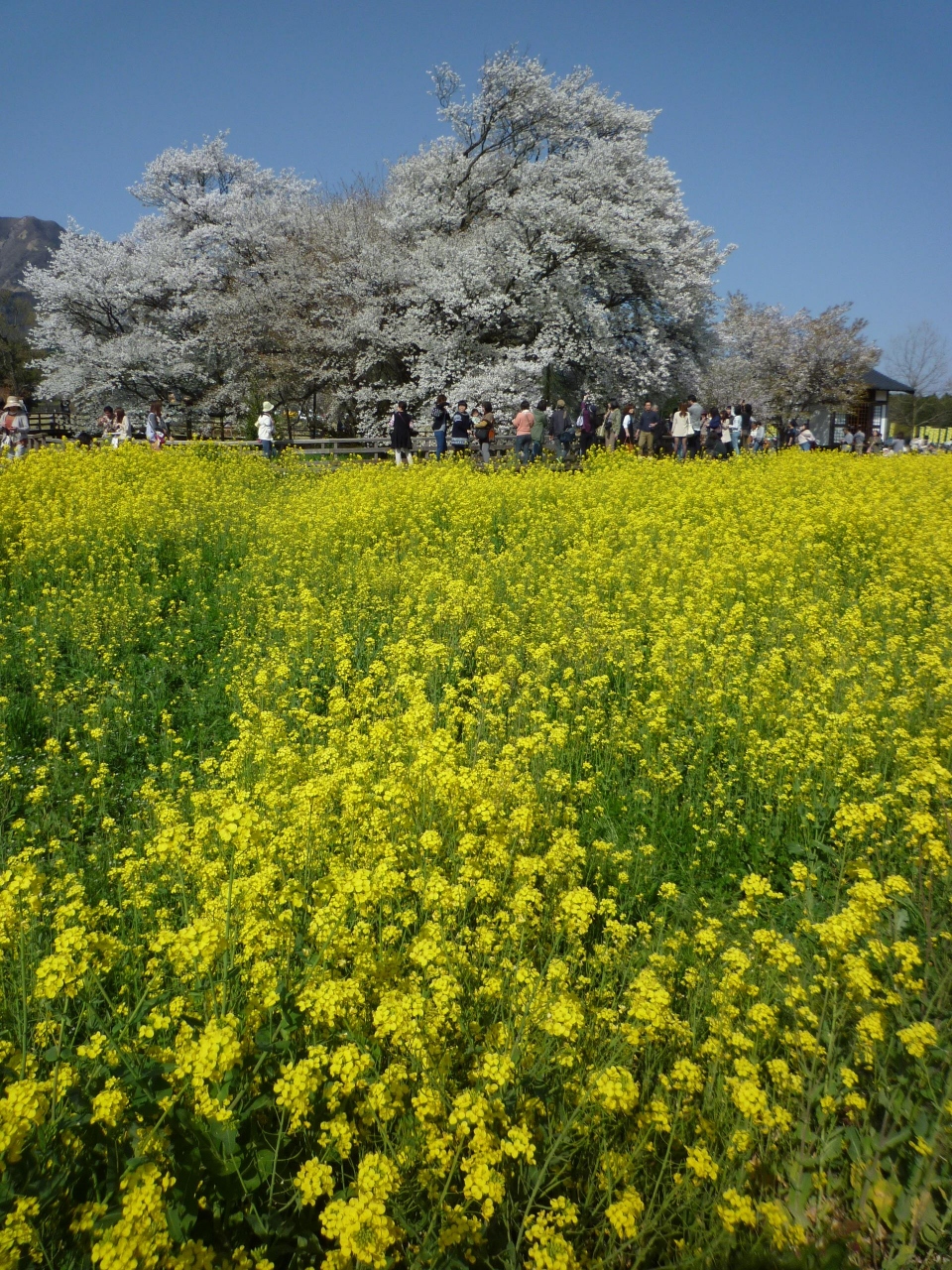 1本の大桜が、菜の花に囲まれてそびえたっています。