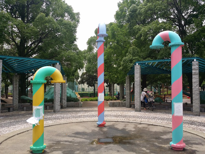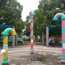上から水が出そうな(実際出てなかったのでわからないですが)水道管みたいな遊具もあります。都会の中の貴重なオアシスですね。