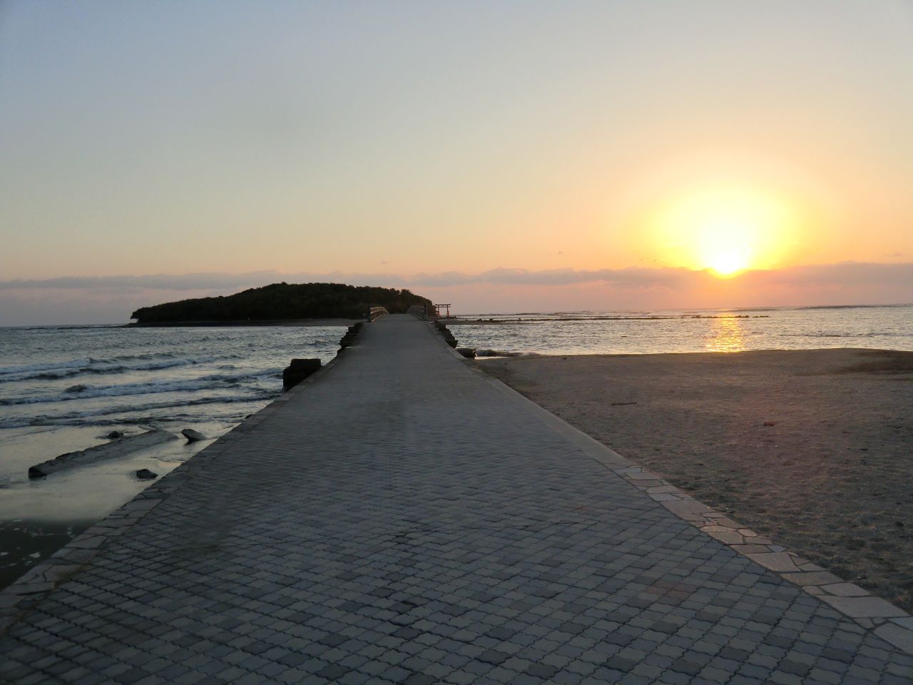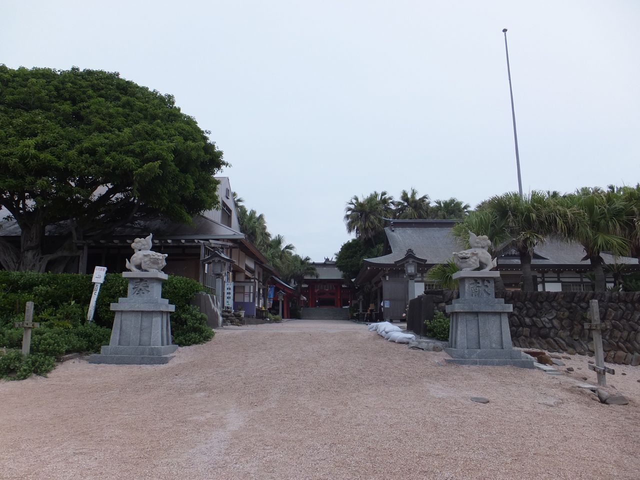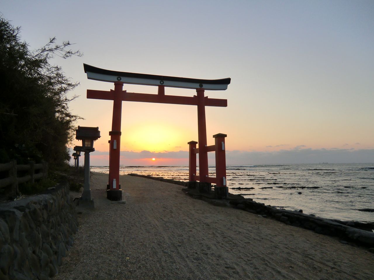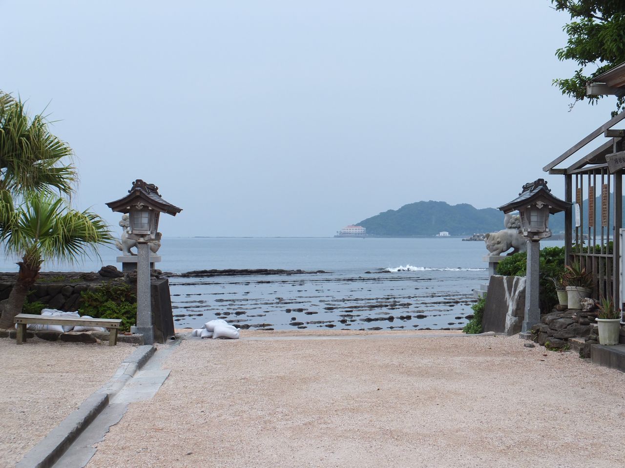 新婚旅行のメッカだった青島の神社。鳥居が島沿いにあり、直角に曲がって参道。島の中心に神社の本殿。