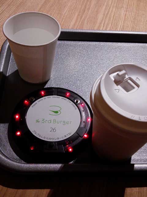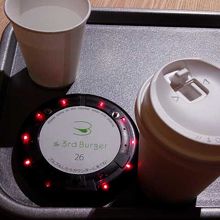 バーガーの焼き上がりは、円形のブザーを渡されて、それが点灯してお知らせします。