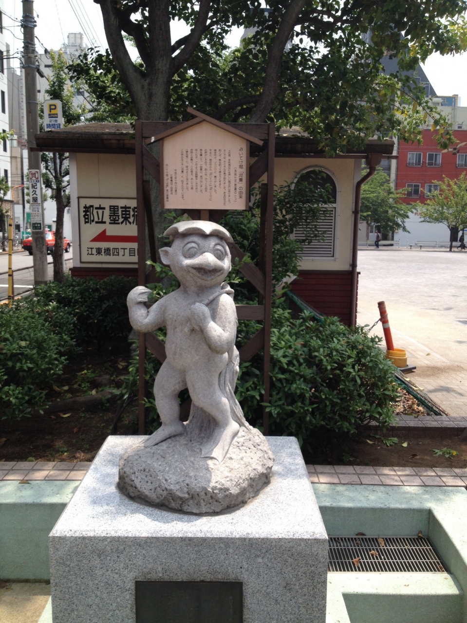 おいてけ堀とは錦糸堀で魚を釣ると、どこからともなくおいてけの声が聞こえ、気がつくと釣ったはずの魚がどこにもないというもので、狸説と河童説に別れています。このことから、おいてけ堀推定値?であるここに河童の像が設立されたようです。