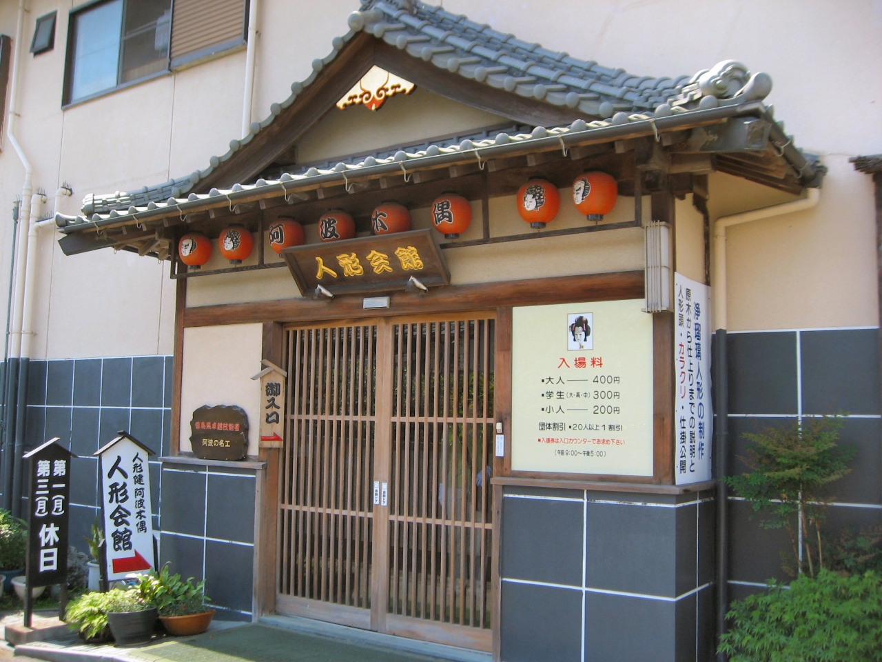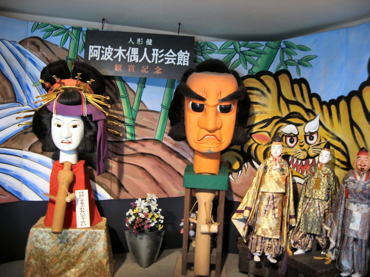 阿波十郎兵衛屋敷のすぐ向かいにある阿波木偶人形会館には、木偶人形がずらり。館長の”人形健”さんから人形づくりやカラクリについての楽しい話も聞けます。人形浄瑠璃で使われる木偶人形や資料などが展示されています。