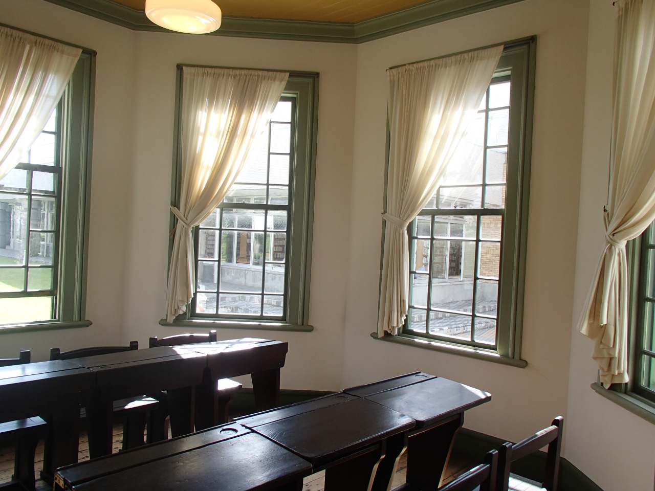 婦人閲覧室にはあの跳ね上げ式の教室机があり、赤毛のアン等あの時代の学校を思い起こさせます。こんなところで読書ができたらいいな。