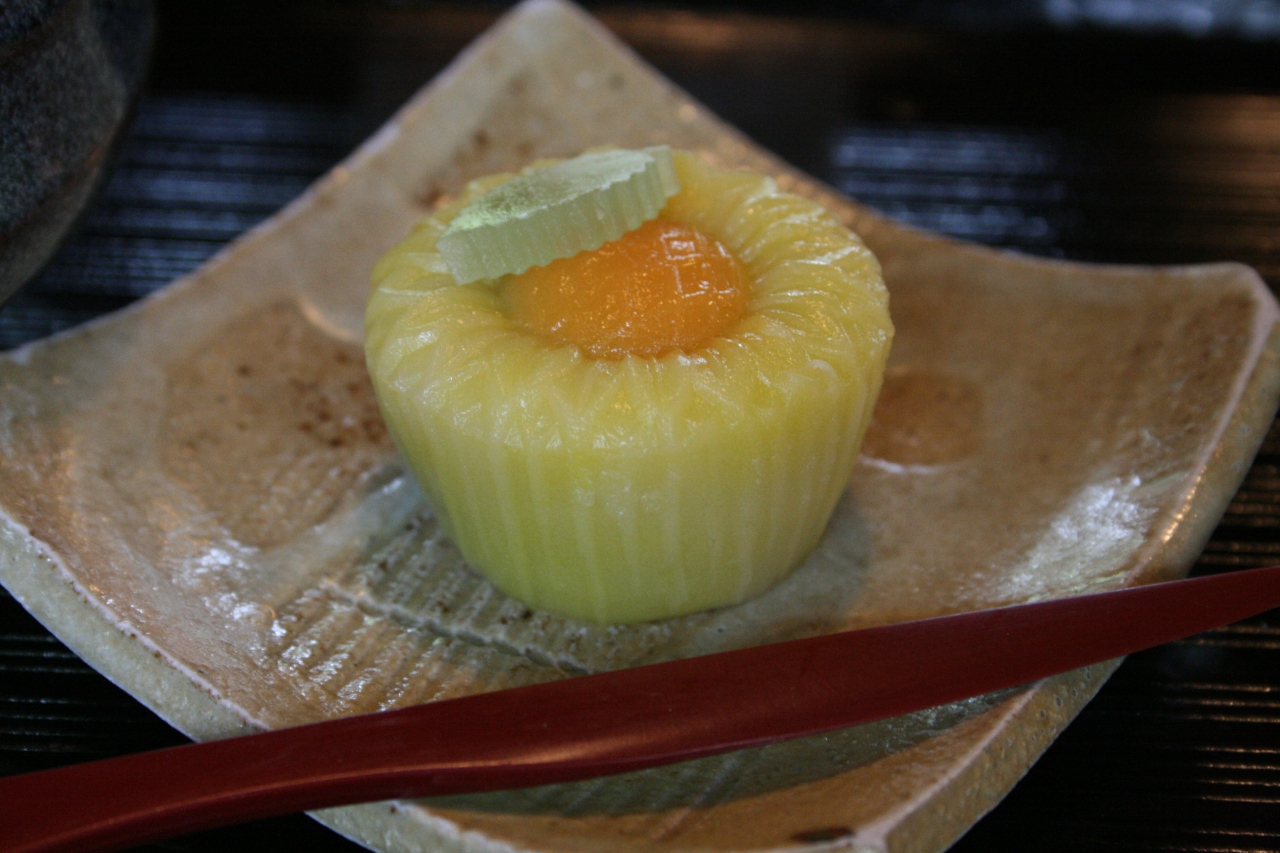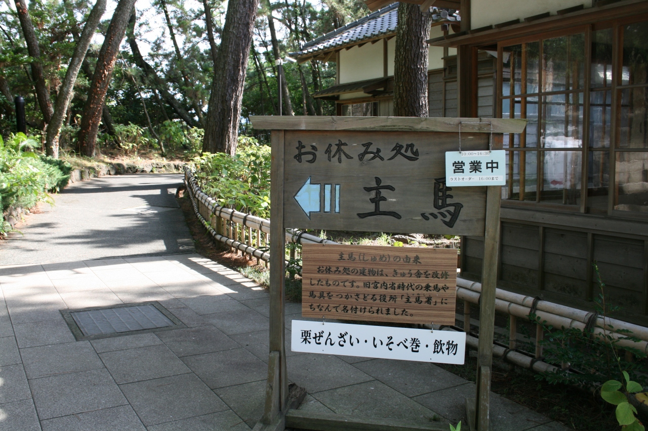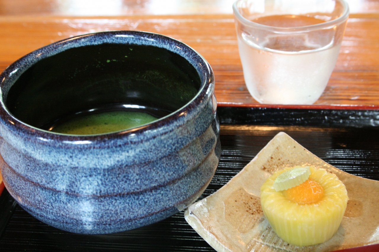和菓子付きのお抹茶をいただきましたが、お菓子はやはり菊?!がかたどられていました。厩舎址の建物を利用しているとのこと。冷房が効いており快適でした。