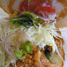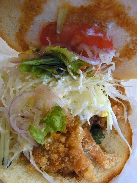 バーガーの中には熱々に揚げられた唐揚げが入っています。