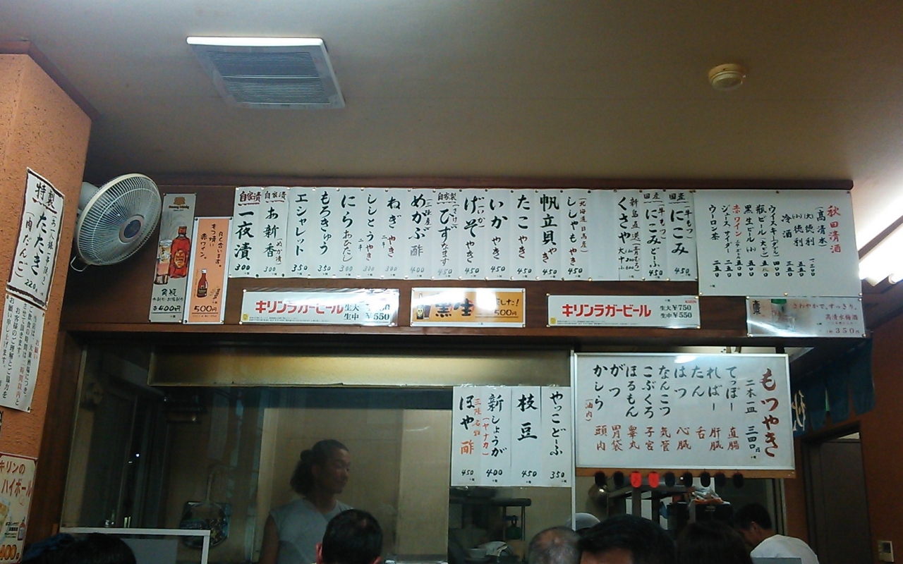 自分が行ったときはたまたま並ばず入れたが、普段は入店待ち行列が長い人気店らしい。もつ焼きは串2本で340円、味も悪くなくコスパが良い。一品料理は300~450円で総じて安いが、妙に量が少なかったり、原価が超安そうなものもあるので要注意。雰囲気はオヤジ向けの大衆酒場と言った感じで、清潔度は高くないし、周りの話し声がうるさい。オヤジ飲みが好きな人にはお勧めだが、落ち着いて野みたい人には向かない。